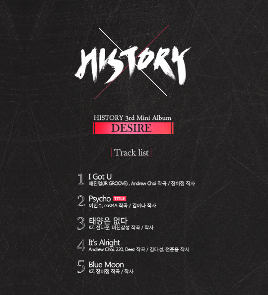 히스토리(HISTORY)는 11일 자정, 공식 페이스북(www.facebook.com/HISTORY426)을 통해 타이틀곡 '싸이코(Psycho)'를 비롯해, '아이 갓 유(I Got U)', '태양은 없다', '잇츠 올라잇(It's Alright)', '블루문(Blue Moon)' 등 총 5곡의 앨범 트랙리스트와 "HISTORY 3rd Mini Album 'DESIRE' Coming Soon!"이라는 글을 게재하며 컴백 소식을 알렸다.
