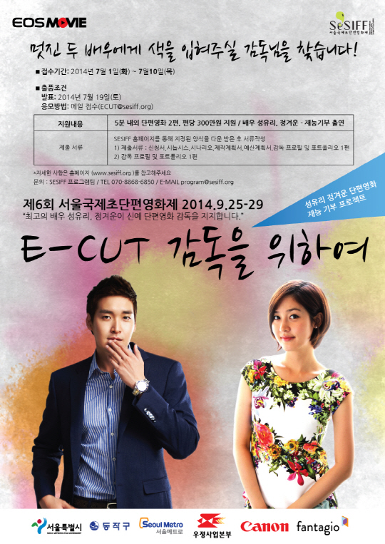 제 6회 서울국제초단편영화제의 단편영화제작지원 EOS MOVIE프로젝트 'E-CUT감독을 위하여'는 배우와 MC를 넘나들며 많은 사랑을 받고 있는 성유리와 드라마 '신의 선물'에서 현우진 역으로 열연을 한 정겨운을 주인공으로 한 시나리오를 공모한다.