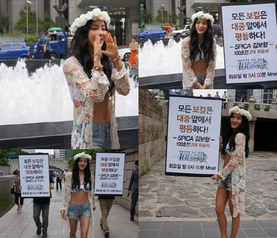 이날 오후 Mnet 측은 공식 SNS를 통해 "오늘낮 12시 청계천 광장에서 진행된 '100초전' 2대 우승자, 스피카 김보형의 당당한 비키니 공약 현장을 전합니다"라는 글과 함께 청계천 광장을 비키니 차림으로 걷고 있는 사진을 함께 게재했다.