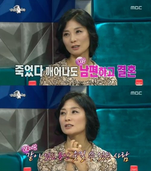 강수진은 "24시간 같이 있는 동안 저를 웃길 수 있는 사람"라며 지지 않고 받아쳤고 김성령은 "우리 남편은 24시간 나와 떨어져 있어서 편하다"고 말해 출연진을 폭소케 했다.