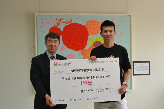 '선행천사' 션이 자전거로 국토 종단 후 1억430만원을 어린이 재활병원 건립을 위한 기금으로 써달라며 푸르메 재단에 기부했다.