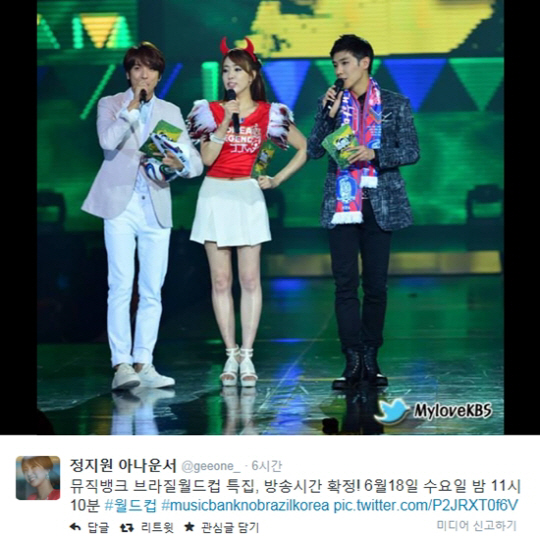 정지원 아나운서는 12일 자신의 트위터 계정을 통해 "뮤직뱅크 브라질월드컵 특집 방송시간 확정! 6월18일 수요일 밤 11시 10분"이라는 글과 함께 한 장의 사진을 게재했다.