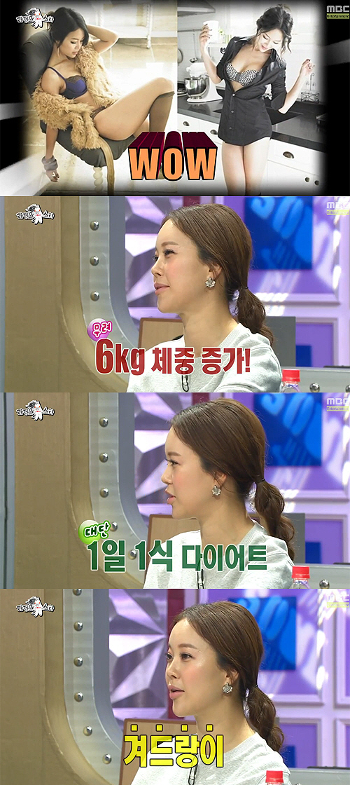 이날 MC들은 "매니저들이 백지영 팔뚝보고 야구방망이 같다고 했다더라"며 운을 뗐다. 이에 백지영은 "1년 4개월 만에 컴백했는데 살이 6kg이 쪘다"며 "살이 너무 안 빠진다. 3주 다이어트로 겨우 3kg 뺐다"고 털어놨다.