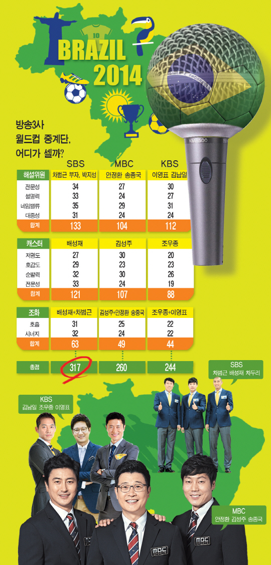 2014 브라질 월드컵의 막이 올랐다. 방송 3사의 중계 경쟁도 본격적으로 시작됐다. 피파(FIFA)로부터 제공받는 경기 영상은 방송 3사 모두 동일하다. 문제는 얼마나 효과적으로 전달하느냐다. 결국 중계단의 전투력에 성패가 달렸다. 그래서 준비했다. 1년 내내 그라운드를 누비거나 축구중계를 밥먹듯 빠지지 않고 챙겨보는 축구전문가이자 '축빠'를 자처하는 본지 축구 전문기자 7명에게 중계단의 전력분석을 의뢰했다. 설문조사는 10개 문항에 대해 각각 5점 만점으로 평가하는 방식으로 이뤄졌다. 전체 문항의 총점은 50점 만점. 설문자 7명의 합계점수는 350점 만점이다. 결과부터 말하면 SBS(합계점수 317점)의 압도적 '우위'와 MBC(260점)-KBS(244점)의 '분전'으로 갈렸다. 하지만 '공은 둥글다'는 축구 격언이 있다. 또, 축구 해설에 대한 전문기자의 시각과 평가기준은 일반 대중의 그것과는 조금 다를 수 있다. 각본 없는 드라마는 그라운드뿐만 아니라 마이크 앞에서도 펼쳐질 수 있다.