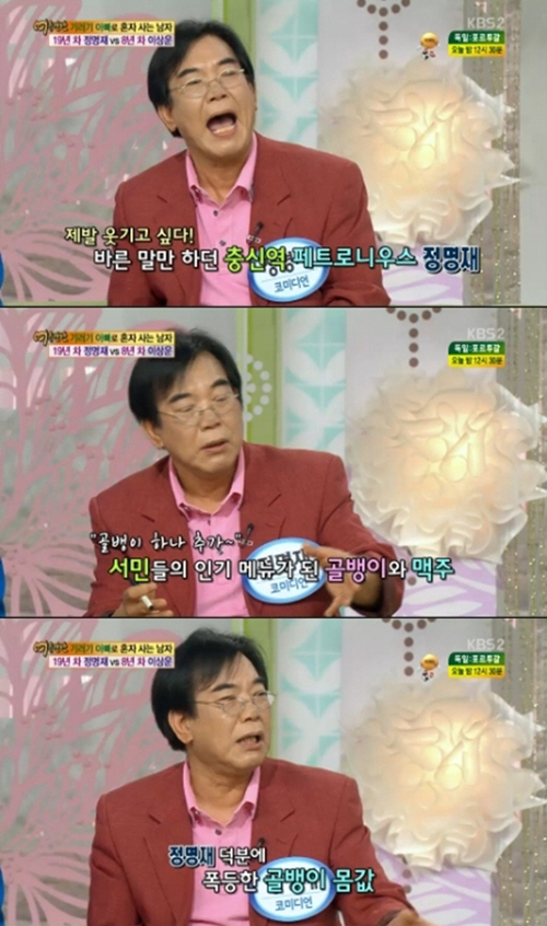 또 정명재는 "골뱅이 광고가 온 게 아니라 껌 광고가 들어왔다. 목소리 때문에 음주운전 후 씹는 껌으로 오해할 수 있다는 지적이 들어와 껌 광고 더빙을 다시하기도 했다"고 말해 웃음을 자아냈다.