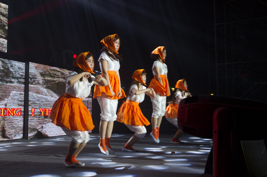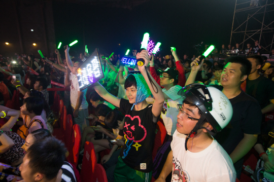 첫 무대에는 게스트 크레용팝이 올랐다. 첫 곡인 '빠빠빠'가 흐르자 관중석에서 똑같은 옷을 입고 두건까지 쓴 한 무리의 팬이 불쑥 일어섰다. 중국판 '팝저씨(크레용팝 아저씨팬)'들이다. 이들은 굵은 목소리로 "크레용팝"을 연호하고 "점핑 점핑" "뛰어 뛰어" 같은 후렴구를 따라 부르며 '직렬5기통' 춤까지 췄다.