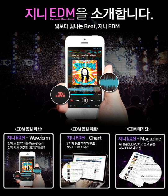 지니EDM서비스는 일렉트로닉댄스 장르에서 가장 인기 있는 곡들을 모아 100위까지 차트로 보여주고 일렉트로닉댄스 장르의 선두 아티스트들의 강렬한 음악세계를 담는 매거진도 운영한다. 또한 지니 플레이어에서는 일렉트로닉 댄스음악과 사운드, 비트 강한 음악들의 파형을 보여주며 다이나믹한 느낌을 시각적으로도 전달하고 3D입체음향으로 다양한 느낌으로 EDM을 즐길 수 있도록 했다.