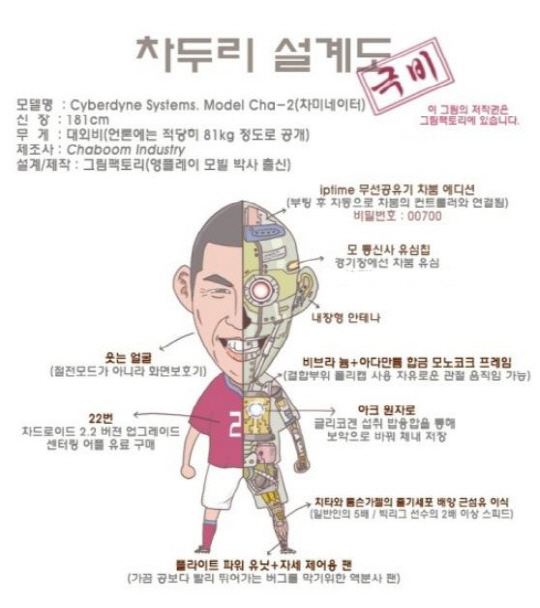 이에 모 축구 커뮤니티사이트에서 네티즌들은 2010년 남아공 월드컵때 큰 화제가 된바있는 '차두리로봇설'과 '차바타'를 올려놓은 것.