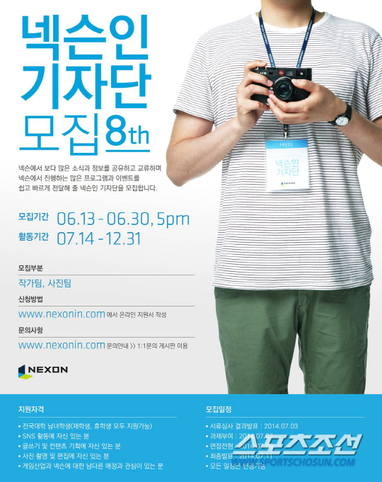 선발된 학생들은 14일부터 12월31일까지 약 6개월간 '넥슨인 기자단'으로 활동하며, 넥슨 컴퍼니 주최 사내행사 및 이벤트, 직원 교육 프로그램, 사회공헌활동 등에 참여해 취재하고, 넥슨인 홈페이지 및 넥슨인 블로그(nxreporter.nexon.com)를 통해 관련 소식을 대외에 알리는 역할을 한다. 활동을 마친 기자단 전원에게는 넥슨 컴퍼니 인턴십 및 공개채용에서 가산점이 부여되며, 활동 결과에 따라 부상도 제공된다. 남정석 기자 bluesky@sportschosun.com