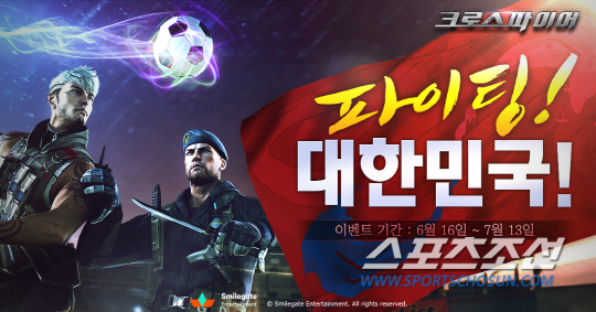 스마일게이트 엔터테인먼트는 브라질월드컵에 출전하고 있는 한국 대표팀의 선전을 기원하기 위해 FPS게임 '크로스파이어'에서 '파이팅! 대한민국' 이벤트와 다양한 아이템을 획득할 수 있는 이벤트를 실시한다. 우선 16일부터 22일까지 7일간 모든 회원들에게 축구공 모자, 파이팅 명함을 지급한다.