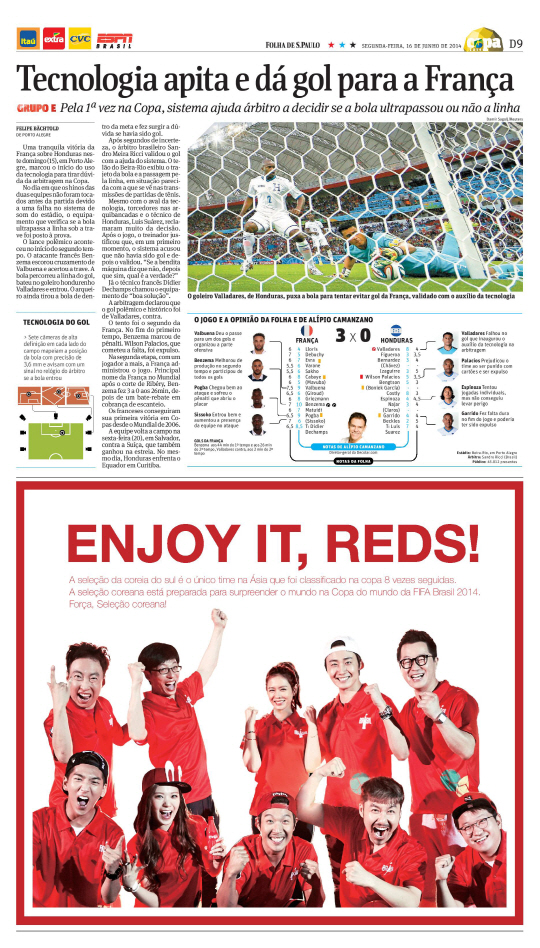 이번 광고는 현지시각 16일 브라질 최대 일간지인 '폴라 데 상파울로' 스포츠섹션 9면의 반면광고로 게재 됐으며 전체적인 빨강색 디자인에 대한민국 공식 응원문구인 '즐겨라, 대한민국!(ENJOY IT, REDS!)'을 헤드라인으로 강조했다.
