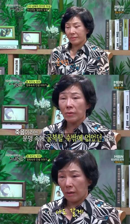 이날 정옥숙 씨는 "최진실 최진영을 떠나보내고 심한 우울증을 겪었다. 아이들을 먼저 보내고 삶의 끈을 놓지 않고 어떻게 견뎌냈는지 지금 생각해도 아찔하다"라고 힘들었던 상황을 털어놨다.