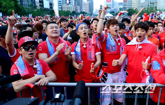 18일 오전 서울 종로구 세종로 광화문 광장에서 '2014 브라질월드컵' H조 한국 대 러시아 예선경기 거리응원이 펼쳐졌다. KBS2 '우리동네 예체능' 응원단이 붉은악마와 함께 응원을 펼치고 있다.