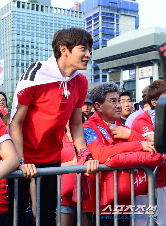 18일 오전 서울 종로구 세종로 광화문 광장에서 '2014 브라질월드컵' H조 한국 대 러시아 예선경기 거리응원이 펼쳐졌다. KBS2 '우리동네 예체능' 응원단 샤이니 민호가 응원을 펼치고 있다.