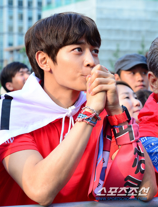 18일 오전 서울 종로구 세종로 광화문 광장에서 '2014 브라질월드컵' H조 한국 대 러시아 예선경기 거리응원이 펼쳐졌다. KBS2 '우리동네 예체능' 응원단 샤이니 민호가 응원을 펼치고 있다.