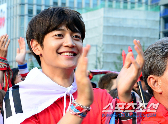 18일 오전 서울 종로구 세종로 광화문 광장에서 '2014 브라질월드컵' H조 한국 대 러시아 예선경기 거리응원이 펼쳐졌다. KBS2 '우리동네 예체능' 응원단 샤이니 민호가 응원을 펼치고 있다.