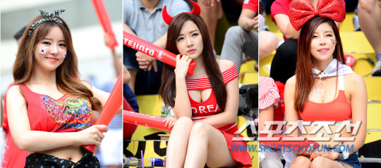 18일 오전 서울 종로구 세종로 광화문 광장에서 '2014 브라질월드컵' H조 한국 대 러시아 예선경기 거리응원이 펼쳐졌다. 이날 볼륨 바디라인을 자랑하는 미녀들의 응원이 눈길을 끌었다.