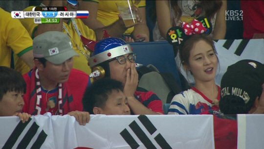 이날 방송 중계화면에는 SBS '힐링캠프-in 브라질' 성유리를 비롯한 MC 및 게스트들의 모습이 포착돼 눈길을 끌었다. 성유리는 '홧팅'이라는 글자가 쓰여진 머리띠를 한 채 김제동, 김민종과 함께 관중석에 앉아 대한민국 선수들을 응원했다. 이들은 현재 브라질 월드컵 특집으로 꾸며지는 '힐링캠프' 촬영 차 현지에 머무르고 있다.