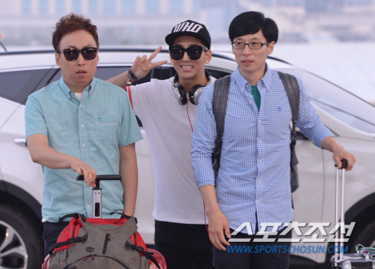 18일 오후 '무한도전 응원단'이 2014 브라질 월드컵 축구대표팀 응원을 위해 인천공항을통해 브라질로 출국했다. B1A4 바로가 박명수, 유재석 사이에서 V를 그려 보이고 있다. 인천공항=김경민 기자 kyungmin@sportschosun.com