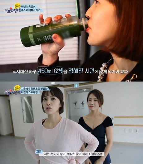 출산 27만에 완벽한 몸매로 복귀한 박지윤은 이날 방송 내내 색색가지 주스를 손에서 놓지 않고 마시는 모습을 보였다.