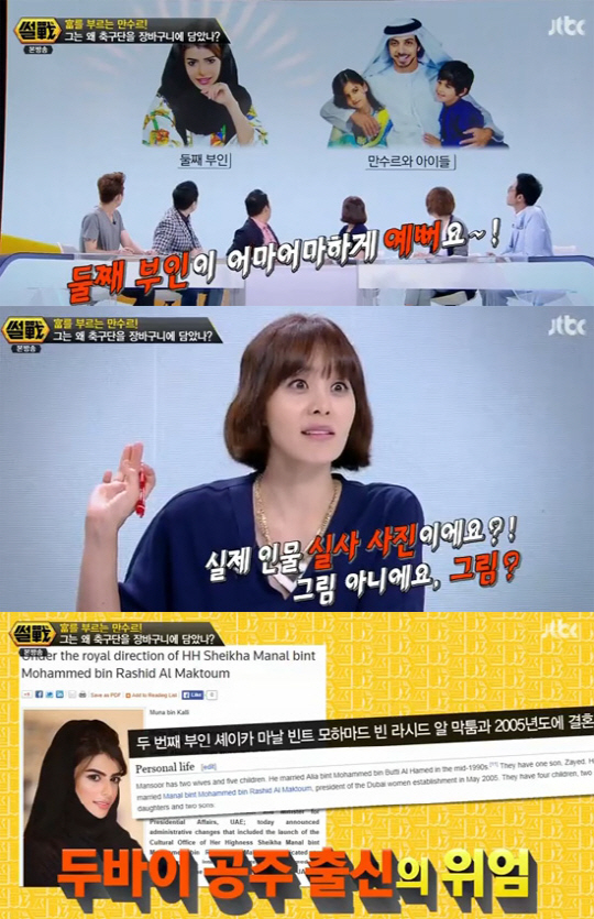 이어 대형 화면엔 만수르 둘째 부인 사진이 공개됐다. 이를 본 박지윤은 "그림이 아니라 실제 사진이냐, 어쩜 저렇게 예쁠 수 있냐"고 감탄했다.