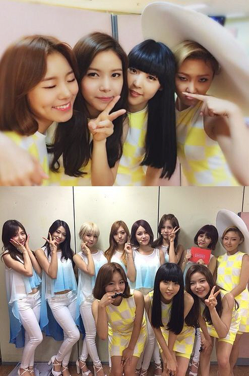 공개된 사진 속에는 노란색 원피스의 무대 의상을 착용한 마마무가 카메라를 향해 첫 지상파 데뷔 무대에 대한 설레는 표정을 드러내고 있어 이목을 집중시켰다. 이어 AOA와 함께 한 인증샷에서 마마무는 AOA와 옹기종기 한데 모여 V자를 그리는 등 환한 미소를 짓고 있어 보는 이들을 덩달아 미소 짓게 했다.
