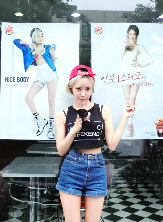 21일 공개된 사진에서 효민은 패스트푸드점 벽면에 나란히 붙은 자신과 지연의 포스터 앞에서 귀여운 포즈를 취하고 있다. 민소매 티셔츠에 핫팬츠로 늘씬한 몸매를 뽐내 눈길을 끈다.