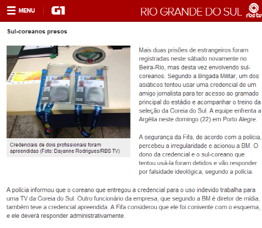 '2014 브라질 월드컵' 현장에서 한국 방송사 제작진이 불미스러운 일에 휩싸여 충격을 주고 있다. 브라질 언론사 'Rio Grande Do Sul'는 21일(현지시각) '한국과 알제리 전이 열리는 브라질 포르투 알레그리의 에스타디오 베이라히우 경기장에서 한국의 방송사 기자가 체포됐다'고 보도했다. 브라질 경찰은 "한국의 한 방송사 기자가 다른 이에게 경기장 출입 ID카드를 양도해 허가되지 않은 이가 경기장 내부에 들어오려 했다"며 "알제리 팀을 보려고 그랬던 것 같다"고 밝혔다. 브라질 현지에 있는 한국 측 관계자에 따르면 출입이 허가되지 않은 다른 방송 출연자가 한 기자의 ID카드를 무단으로 빌려 경기장에 들어가려고 시도했던 것으로 파악된다. 브라질 경찰은 즉각 FIFA에 알렸고 FIFA와 브라질 경찰은 이번 사건에 대한 처리를 협의중이다. 해당 방송사는 정확한 사태 파악을 서두르며 수습에 나선 것으로 알려졌다.