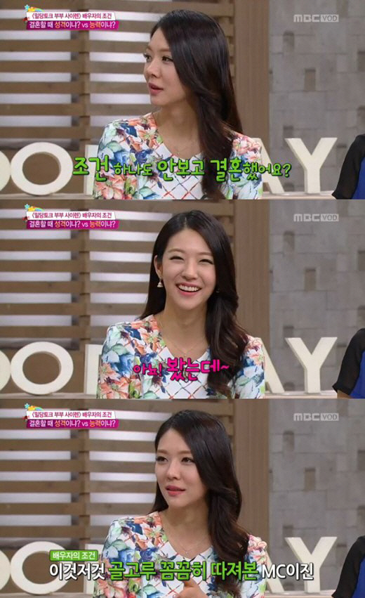 이날 이진 아나운서는 "결혼할 때 배우자의 조건을 봤느냐"는 질문을 받고 "조건을 봤다"고 솔직하게 답했다.