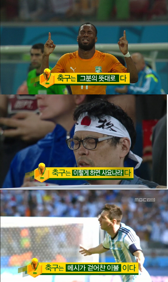지난 15일 코트디부아르와 일본의 경기 후에는 김현식의 '비처럼 음악처럼'과 베토벤의 '합창 교향곡'을 배경음악으로 "축구는 '그분의 뜻대로'다"라는 자막이 나갔다. 내전을 일주일간 멈추게 한 '검은 예수' 드록바가 경기장에 들어온 후 코트디부아르가 2골을 넣으며 역전한 상황을 떠올리게 하는 자막으로 많은 시청자들의 눈길을 사로잡았다.