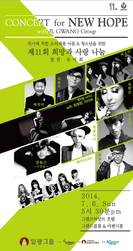 일광그룹의 후원으로 오는 7월 6일 서울 하얏트호텔 그랜드볼룸에서 펼쳐지는 위기에 처한 소외계층 아동 & 청소년을 위한 '제 11회 희망과 사랑 나눔 열린 음악회'에 배우 최정원과 양동근, 가수 김범수, 아이비, 씨스타, 정준영, 레이디스 코드 등 국내 최고의 스타들이 함께 한다.