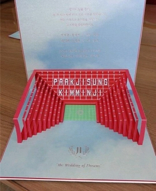 공개된 사진 속에는 팝업 형식으로 만들어진 붉은색 축구 경기장 모형의 청첩장이 담겨 눈길을 사로잡았다.