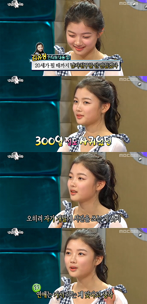 이날 MC들은 김유정이 과거 인터뷰에서 '20세가 될 때까지 남자친구를 안 만들겠다'고 한 발언을 언급하며 "오랫동안 만난 남자친구가 있다고 들었다"고 운을 뗐다.