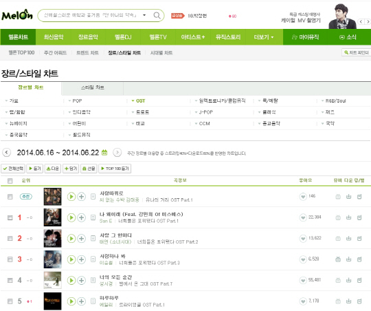27일 오전 멜론, 엠넷, 소리바다, 지니(케이티뮤직) 등 국내 최대 음원사이트의 OST 차트 1위를 '너포위'의 OST 산이가 부른 '나 왜이래'가 차지, 그 밖에도 이승철의 '사랑하나봐', 태연의 '사랑 그 한마디', 권진아의 '그대만 보여요' 등이 나란히 랭크되며 그 인기를 이어가고 있는 것.