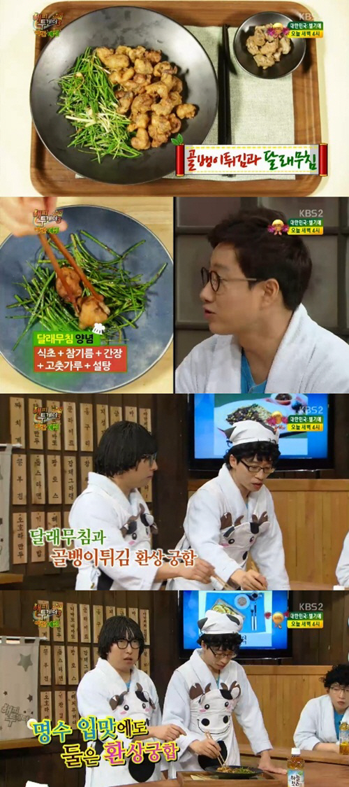 '우뱅이 튀김'은 골뱅이 튀김과 달래무침을 합친 것으로, 밀가루 대신 치킨 파우더를 사용, 깡통 골뱅이 육수와 다진 양파를 섞어 튀김옷을 만들었다. 여기에 물기를 제거한 골뱅이를 묻혀 기름에 넣어 튀기면 완성. 또 달래무침은 식초, 참기름, 간장, 고춧가루, 설탕을 섞어 만든 양념으로 버무리면 된다.