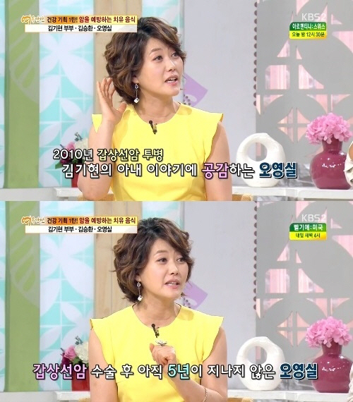 오영실은 7월 1일 방송된 KBS2 '여유만만'의 '건강 기획 1탄'에 출연해 암을 예방하는 치유 음식에 대해 이야기를 나눴다.