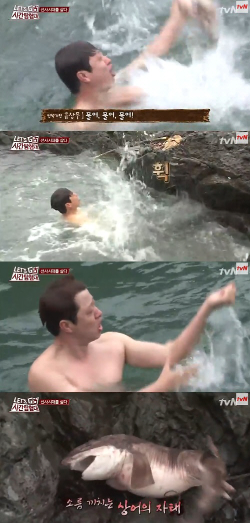 개그맨 유상무가 자신이 맨손으로 잡은 물고기가 '상어'라는 말에 놀라며 욕설을 내뱉었다.