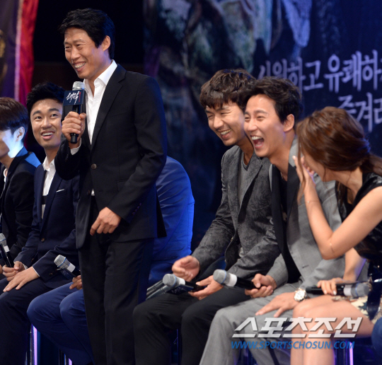 영화 '해적:바다로 간 산적(감독 이석훈)'의 제작보고회가 2일 서울 광화문 나인트리컨벤션에서 열렸다. 유해진의 인사말에 동료배우들이 폭소를 터뜨리고 있다. 영화 '해적:바다로 간 산적'은 조선 건국 보름 전 고래의 습격을 받아 국새가 사라진 전대미문의 사건을 둘러싸고 이를 찾는 해적과 산적, 그리고 개국세력이 벌이는 바다 위 통쾌한 대격전을 그린 액션 어드벤처로 오는 8월6일 개봉 예정이다. 허상욱 기자 wook@sportschosun.com/2014.07.02/