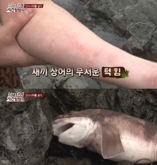 '시간 탐험대' 유상무가 새끼 상어에게 팔을 물리며 제작진에 분노, 웃음을 자아냈다.