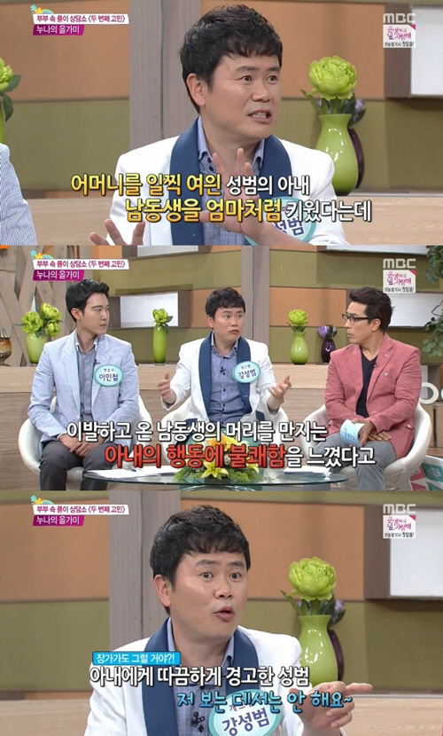 강성범은 "처남이 이발하고 우리집에 놀러왔을때 집사람이 머리를 만지는데 질투심이 느껴졌다"며 "괜히 남에 남자한테 그러는 것 같았다"고 처남과 아내의 스킨쉽에 질투를 느꼈다고 고백했다.