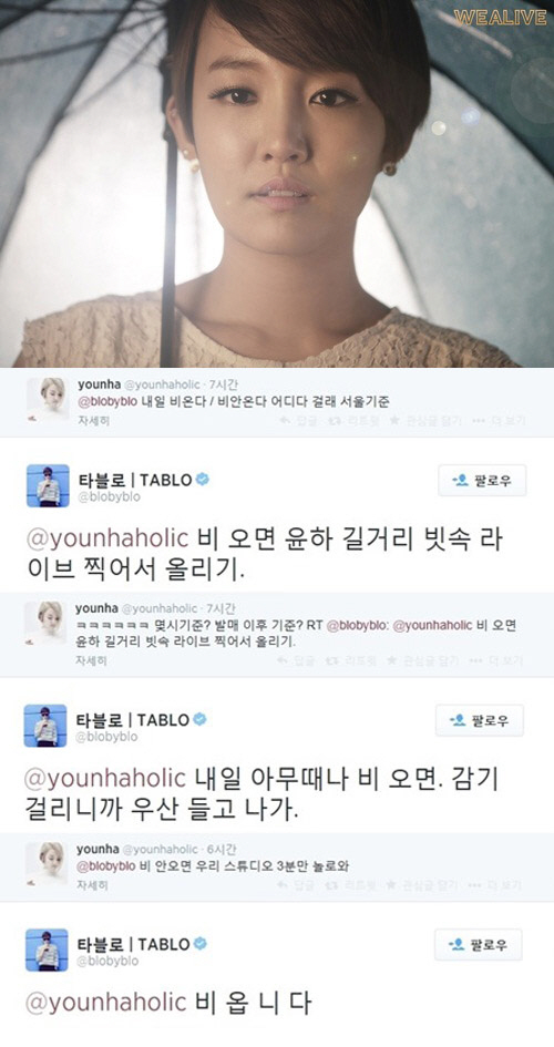 타블로는 "비 오면 윤하 길거리 빗 속 라이브 찍어서 올리기"라고 미션을 제시한 뒤 "내일 아무 때나 비 오면. 감기 걸리니까 우산 들고 나가"라며 다정한 선배의 모습을 보였다.