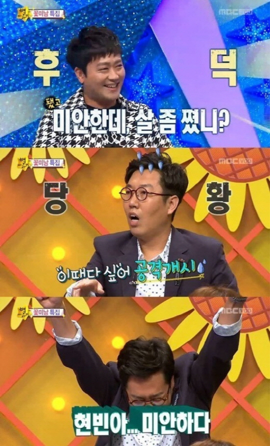 이날 패널인 김영철은 박현빈에게 "'꽃미남 특집'인데 한 분이 유독 걸린다. 저 분은 그냥 남자 가수인데 화장을 하고 있는 것이 아닌가"라며 "현빈아, 미안한데 살 좀 쪘니?"라고 돌직구를 날렸다.