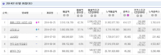 영화 '트랜스포머: 사라진 시대'가 5일 41만4127만 관객을 동원하며 전국 관객 378만3619명을 기록, 박스오피스 1위를 탈환하며 뜨거운 흥행세를 이어가고 있다.