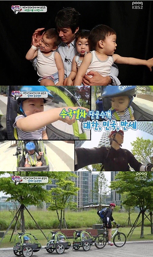 송일국은 이날 세쌍둥이에게 헬멧을 씌워 근처 공원으로 외출했다. 세쌍둥이를 태운 작은 기차 같은 기구를 자전거로 끌고 간 송일국은 "그건 이동수단이 아니라 내 운동수단이다. 운동은 해야 하는데 방법은 없어 만들어냈다"고 설명했다.