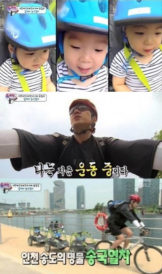 송일국 자신의 자전거 뒤에 3칸짜리 열차를 연결해 아이들을 싣고 달리는 그의 모습은 이색적이면서도 재미있는 풍경을 자아냈다.