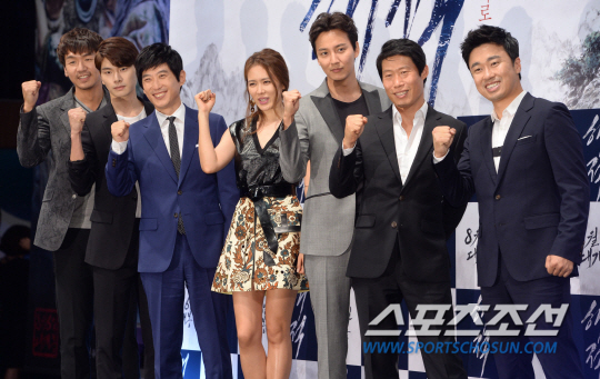 영화 '해적:바다로 간 산적(감독 이석훈)'의 제작보고회가 2일 서울 광화문 나인트리컨벤션에서 열렸다. 김태우, 이이경, 김원해, 손예진, 김남길, 유해진, 조달환(왼쪽부터)이 포즈를 취하고 있다. 영화 '해적:바다로 간 산적'은 조선 건국 보름 전 고래의 습격을 받아 국새가 사라진 전대미문의 사건을 둘러싸고 이를 찾는 해적과 산적, 그리고 개국세력이 벌이는 바다 위 통쾌한 대격전을 그린 액션 어드벤처로 오는 8월6일 개봉 예정이다. 허상욱 기자 wook@sportschosun.com/2014.07.02/