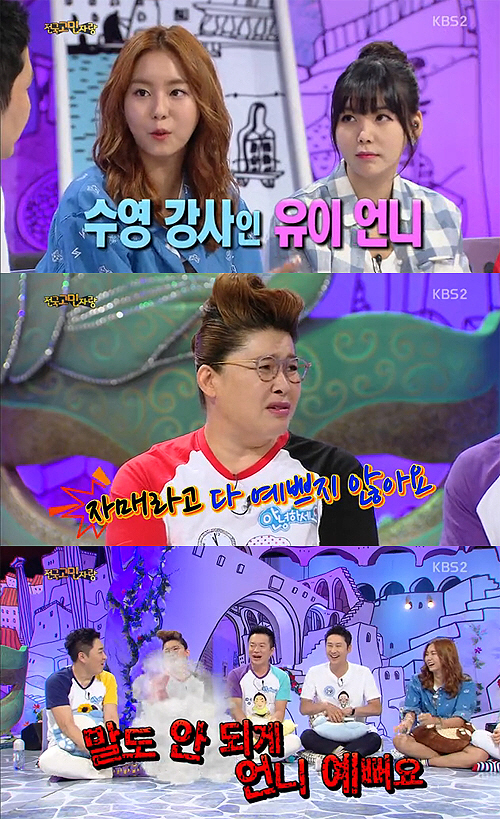 이날 MC들은 수영선수 출신 유이에게 "MC 중 누가 가장 수영을 잘할 것 같으냐"고 물었다. 이에 유이는 "친언니가 수영 강사인데 언니한테 들었을 때 굉장히 근육이 큰 사람은 잘하지 못할 것 같다고 하더라"며 "신동엽이 얍삽해서 잘할 것 같다"며 말실수를 해 웃음을 자아냈다.