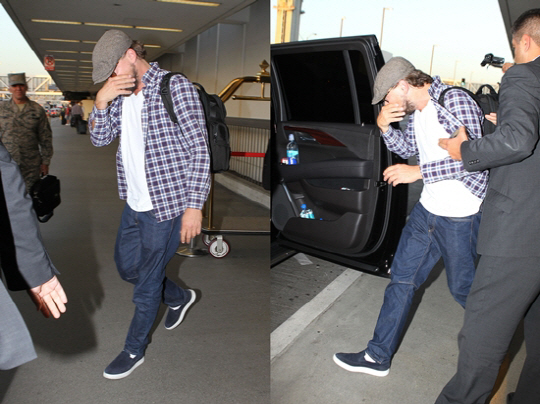 레오나르도 디카프리오는 덥수룩한 수염과 모자, 손으로 얼굴을 가린 상태였다.