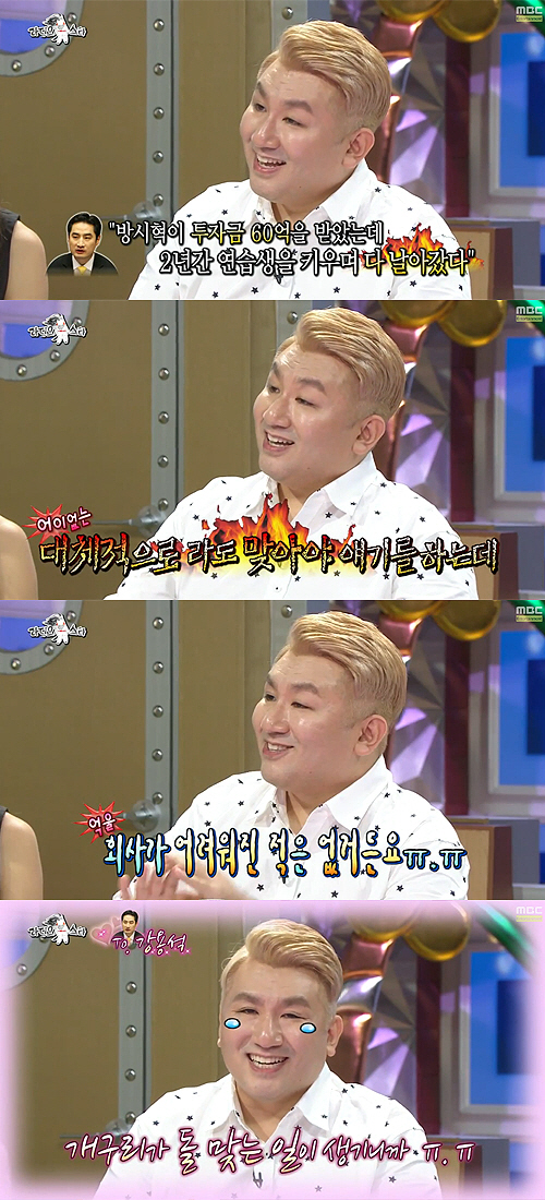 이날 MC 김구라는 "방시혁이 과거 강용석 변호사가 방송에서 '방시혁이 투자금 60억을 받았는데 2년간 연습생을 키우면서 투자금이 다 날아갔다'고 말한 것 때문에 곤혹스러웠다고 하더라"며 운을 뗐다.
