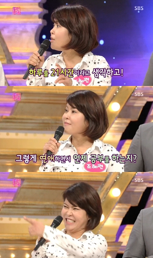 MC 이휘재는 "연애하느라 바쁠텐데 언제 외국어 공부를 하는건가?"라고 물었고, 조혜련은 "도서관에서 연애한다"고 답해 눈길을 끌었다.